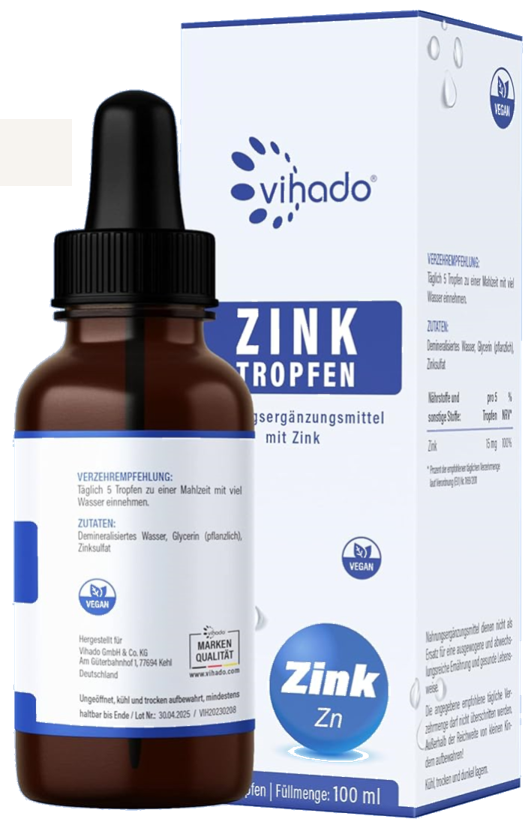Zinc it's a key contributor to a healthy immune system, metabolic function, as to promoting healthy skin, hair, and fertility. This zinc drops from Vihado, are our preferable alternative to tablets or capsules, delivering zinc without additives, an effortless way to fortify your family´s health.